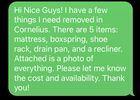 Nice Guys arrives at the agreed upon time, on time. We quickly and professionally make your junk disappear!!